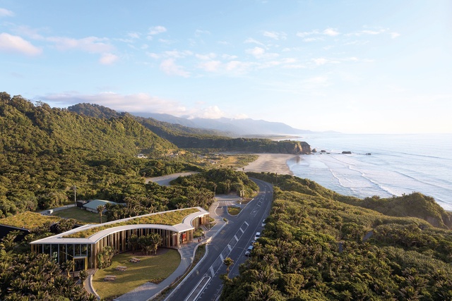 “The Punangairi Visitor Centre is superbly situated on its site, nestled amongst the existing nīkau with the backdrop of the Southern Alps. The building deploys a series of curved elements in plan, which, together with a sloping green roof, allows it to insert itself gently into its site while providing for views out into the trees as well as distant views of the alps. It takes advantage of the opportunities of the site to provide a sense of generosity and welcome, and enhances the surrounding outdoor spaces and lawn. Timber is used extensively to reduce its carbon footprint as well as to reflect the vertical stands of nīkau. The centre is an open and welcome addition to Punakaiki, enhancing the visitor experience to this well-known landmark.”
