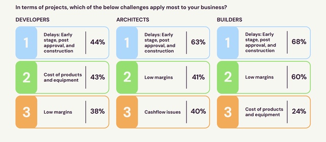 Hubexo’s Sentiment Survey shows 63 per cent of architects, 68 per cent of builders and 44 per cent of developers list delays as their biggest obstacle. Low margins follow, affecting 41 per cent of architects and 60 per cent of builders, while cashflow pressures remain a recurring issue.