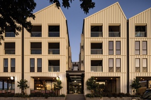 While the development is a little taller than are the surrounding portside structures, the building at street level does not feel out of scale or overbearing. The Resource Consent to extend through the height restriction was worth the effort — a lesser scale on this corner could have been underwhelming. The western elevation adjoining the port warehouses adopts a similar sawtooth roof form and is linked in its response to the local context. The articulation of the façades is gentle and considered, emphasising a verticality, deck voids, protruding balconies, and pushing and pulling of masses to appear as many smaller buildings conjoined. The use of a white-coloured, vertical metal cladding accompanied by the black pressed-steel window spandrels, balconies and canopies acknowledges the area’s maritime and industrial past.