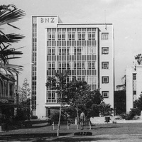 The BNZ was a seven-storey commercial building located next door to the firm’s 1940 Post Office, with both buildings featuring double-height entries. The bank is believed to have been the first commercial building in Hamilton with centralised air conditioning. Mahogany was used for the front face of the public counters as well as the double-height concrete columns, as was the case in the Hamilton Municipal Offices (1960), which today remain largely original. The exterior façade glass had a green hue, a colour that was carried inside with the vinyl counter tops and emerald-green carpet. See NZIA Journal Aug 1965.