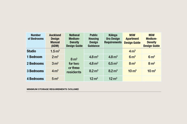 The rise of the self-storage industry clearly demonstrates the market’s response to a deficit of domestic provision in MDH. But what are residents’ actual experiences? A recent Auckland Council study sheds light on this. In 2023, Auckland Council’s Economic and Social Research and Evaluation team and Tāmaki Makaurau Design Ope (TMDO) completed the Life in Medium Density Housing in Tāmaki Makaurau study. This research investigated how Aucklanders are experiencing life in recently built MDH, providing analysis of 57 design attributes based on online surveys completed by 1243 households. The findings painted an objective picture of six years of intensification. Feedback regarding the human need for storage was clear: “Storage is inadequate for many households. Over half of all the participants reported that they had insufficient storage for general household items (e.g. vacuum cleaner), linen, kitchen equipment and food, and occasional items (e.g. suitcases).” “For those households with a garage and at least one car, half used it for purposes other than parking their car, including storage, exercise, as a study and for other living activities.” Notably, the draft Unitary Plan originally included minimum standards for storage provision, with the purpose to “ensure dwellings have sufficient space for the storage of everyday household items and bulky items, such as bicycles”, but these were removed in the operative plan. The reason — whether developer lobbying or otherwise — is unclear but the effect is the creation of a clear deficit. Despite this, bestpractice guidance does remain for minimums, as summarised in the table opposite. Global ergonomics and housing research generally suggests that the average human adult generates 1–1.5m3 of long-term storage need (seasonal clothing, sports gear, archives, tools, etc.) in addition to daily cabinetry. This is roughly equivalent to the storage volume of our top-selling family wagon, the Toyota RAV4, which provides 1.6m3 of storage with the seats down.